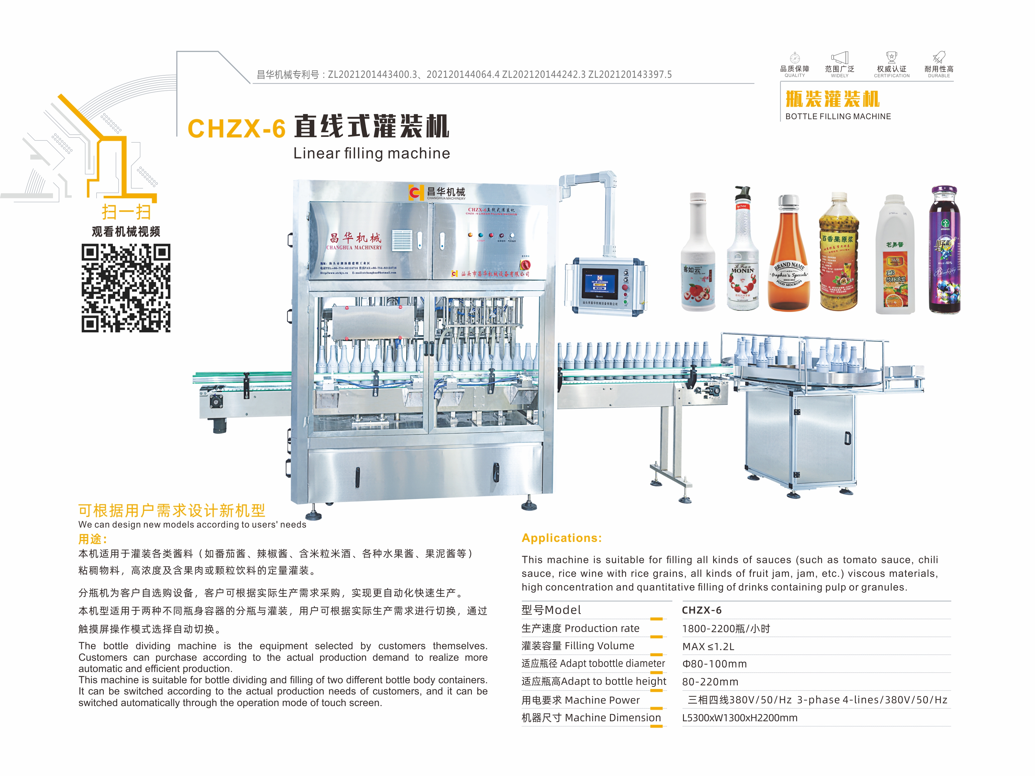 昌華機(jī)械的主要產(chǎn)品包括:充填封口機(jī)系列、自立袋充填旋蓋機(jī)系列、給袋式包裝機(jī)系列、立式包裝機(jī)系列、瓶裝灌裝機(jī)、后道殺菌、包裝生產(chǎn)線系列等。